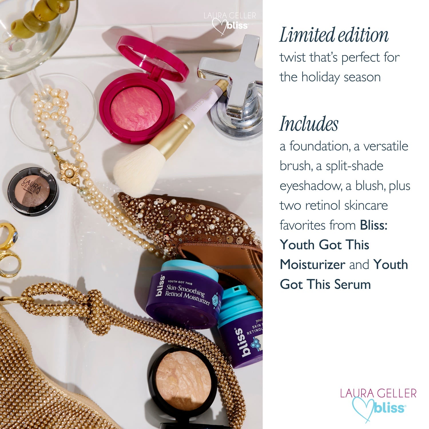 • Includes Bliss' Youth Got This Retinol Serum and Moisturizer to target the look of fine lines, our iconic Baked Balance-n-Brighten Color Correcting Foundation for natural coverage that never cakes or creases, a limited-edition Baked Blush-n-Brighten, a versatile Baked Eyeshadow Duo and two limited-edition makeup brushes